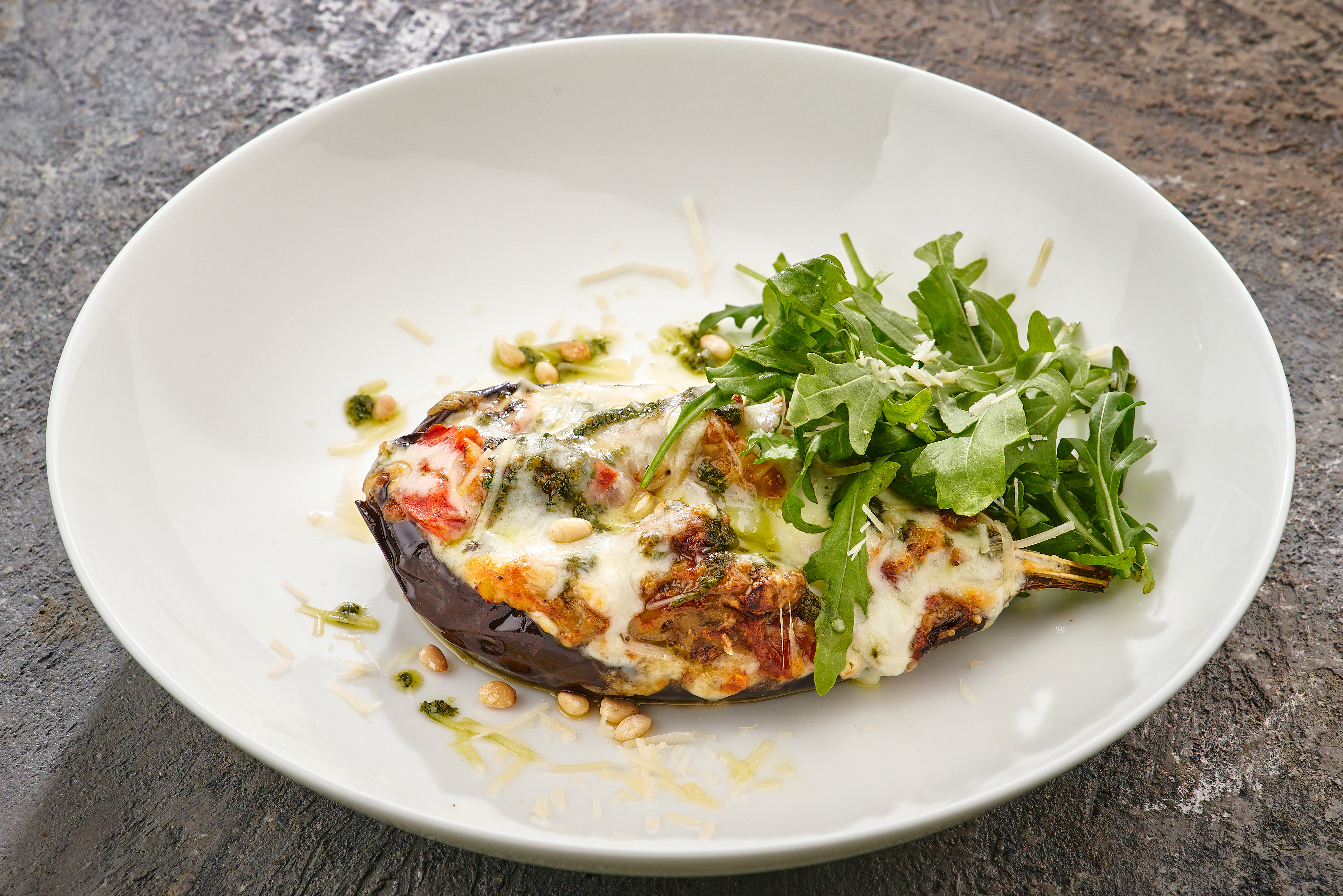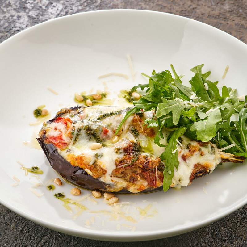 СОСТАВ: баклажан, томаты, сыр моцарелла, сыр пармезан, соус песто, листья рукколы, орех кедровый