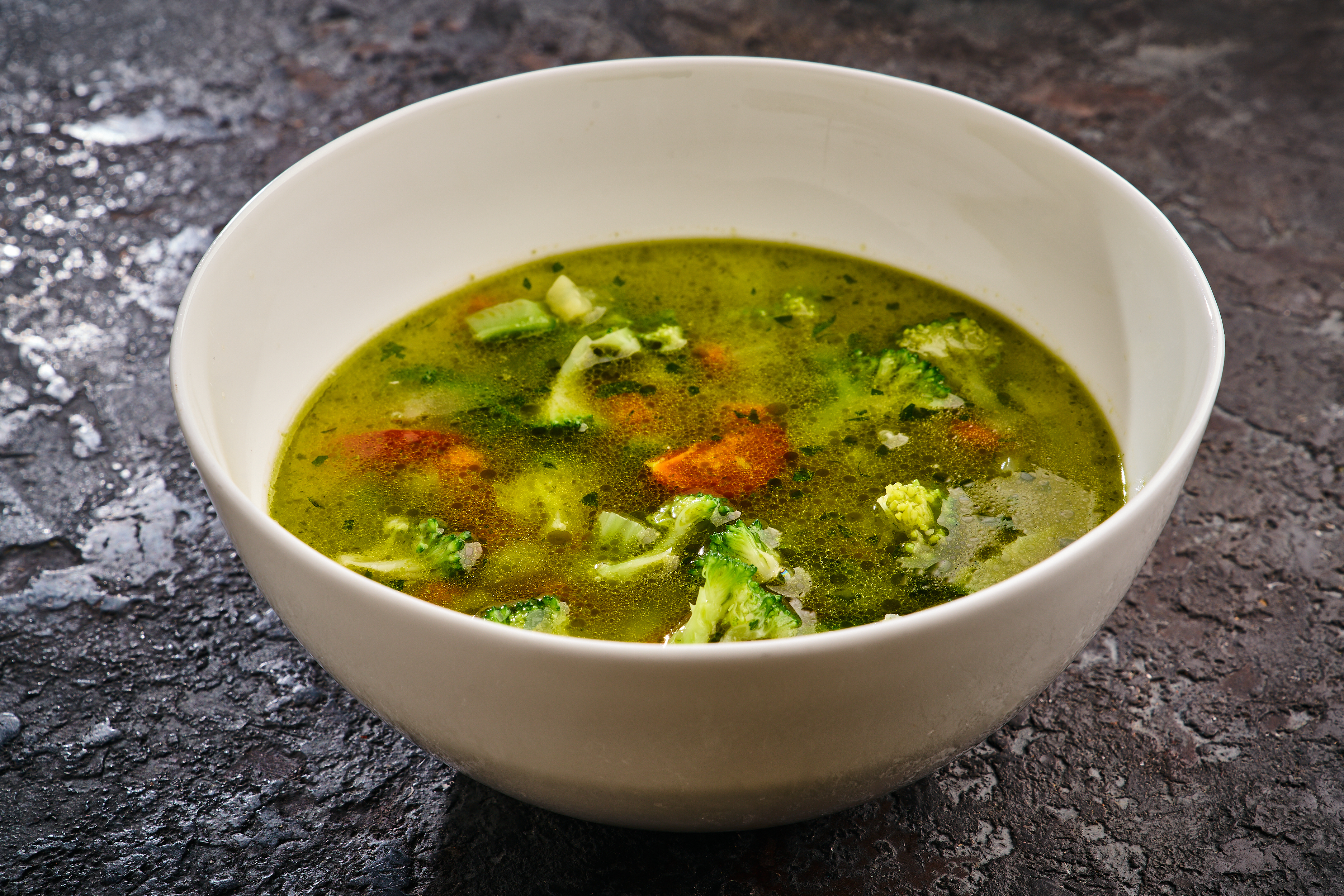 СОСТАВ: овощной бульон, морковь, брокколи, цуккини, томаты, сельдерей, спаржа, бобы эдамаме, зелень петрушки