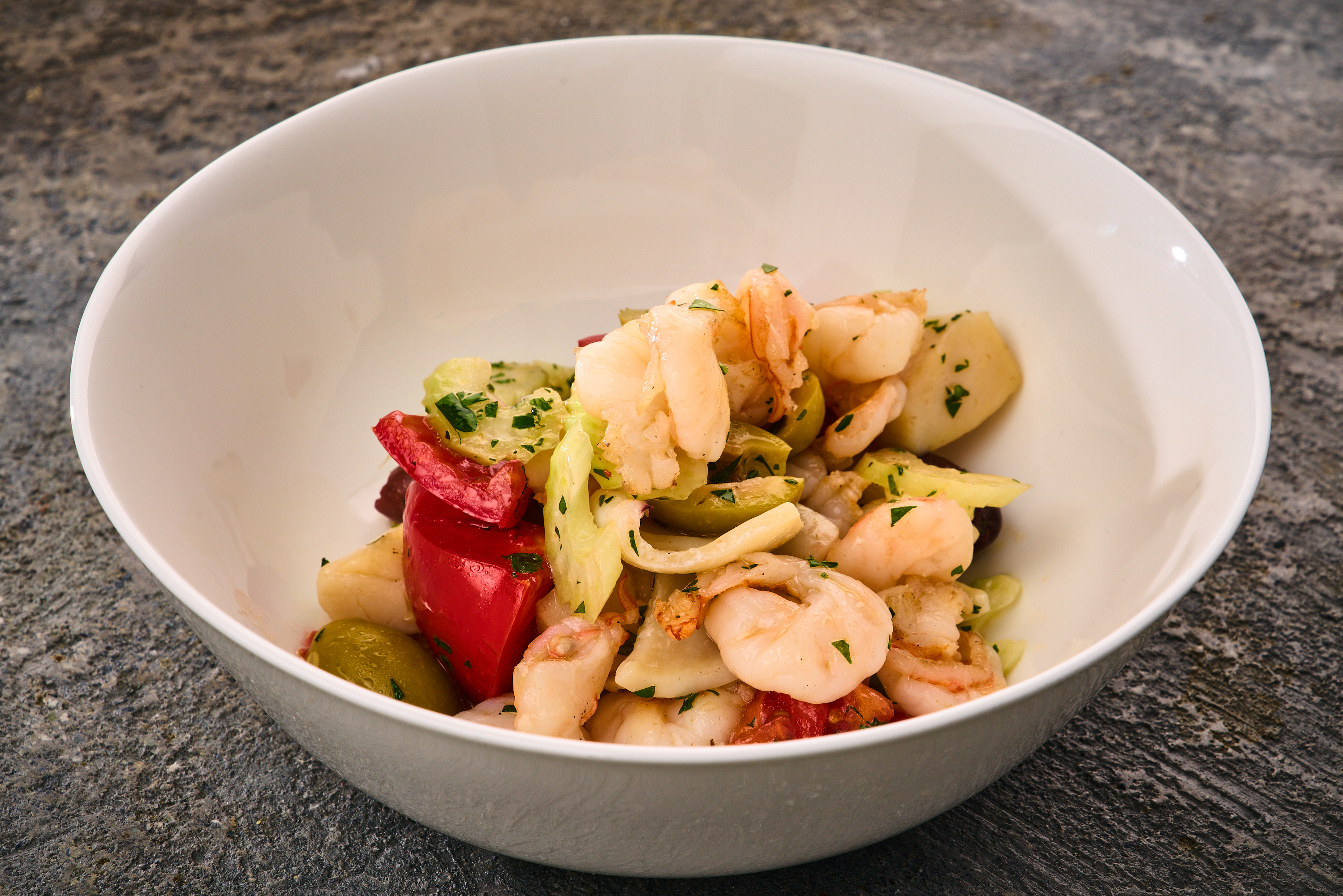 СОСТАВ: креветки, кальмары, гребешок, маслины, оливки, стебель сельдерея, томаты, петрушка, сок лимона, масло оливковое