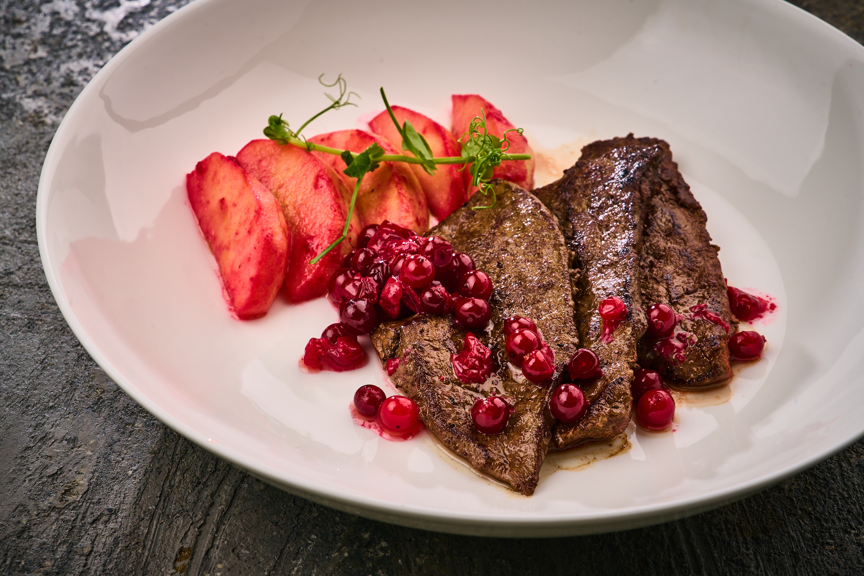 Стейк из говяжьей печени с печеными яблоками и клюквой 1/200