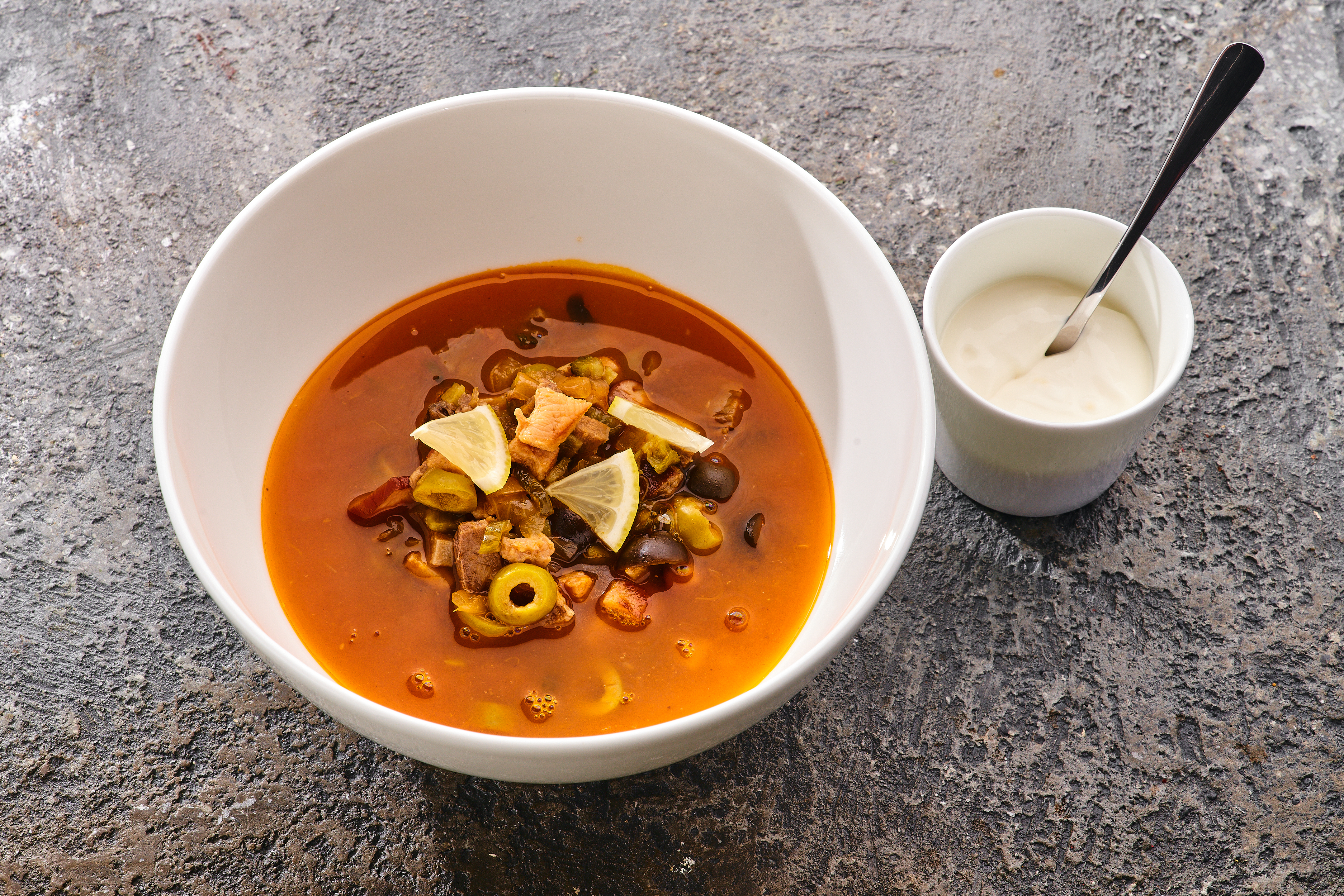 СОСТАВ: бульон куриный, язык говяжий , куриная грудка копченая, маслины, оливки, томаты, каперсы,сметана, лимон