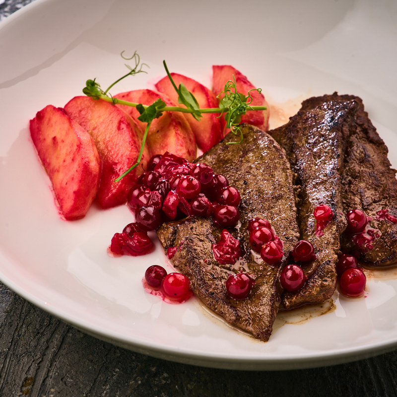 Стейк из говяжьей печени с печеными яблоками и клюквой 1/200