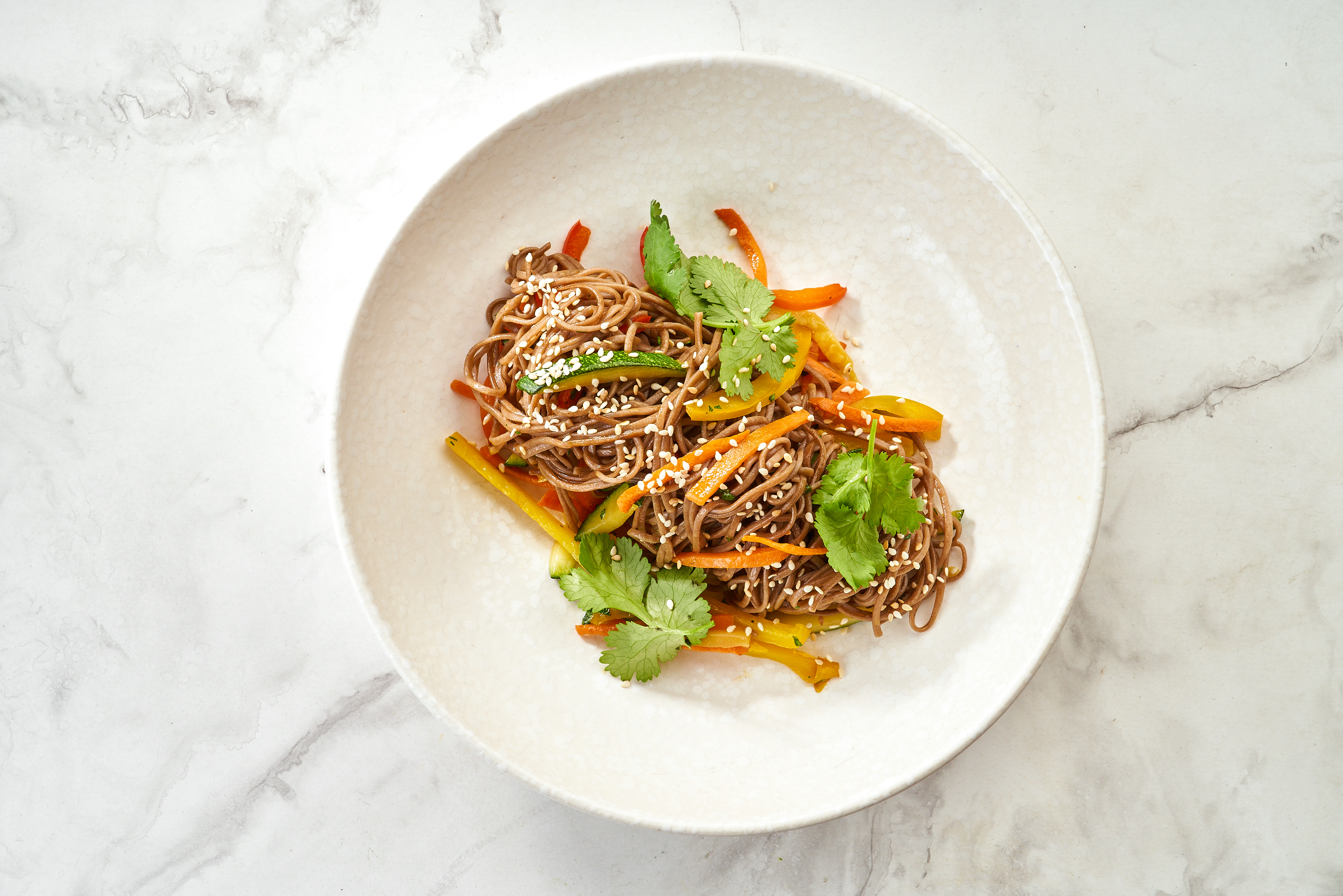 Состав: лапша гречневая, перец болгарский, морковь, цуккини, кинза, кунжут, масло кунжутное, соус соевый