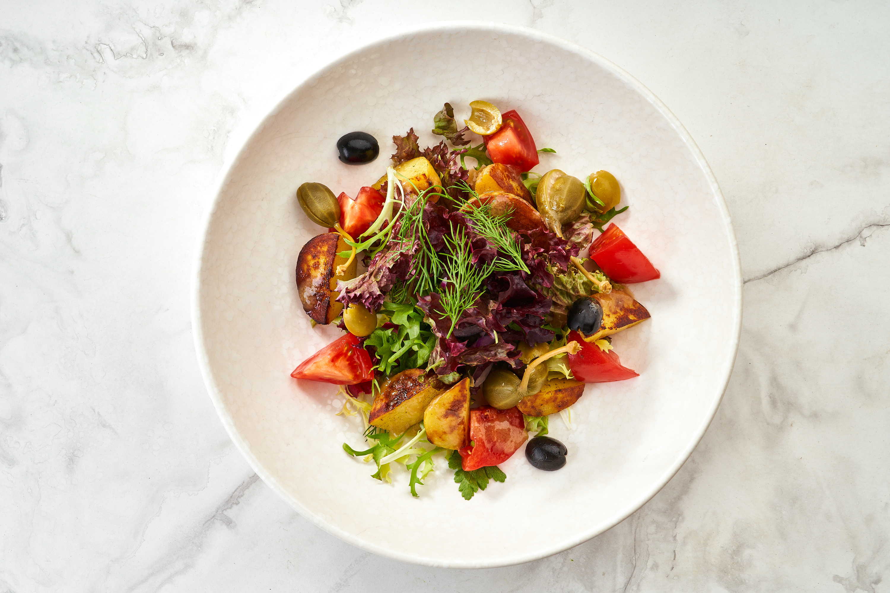 Состав : картофель, томаты, каперсы, листья салатов, маслины, лук, соус итальянский