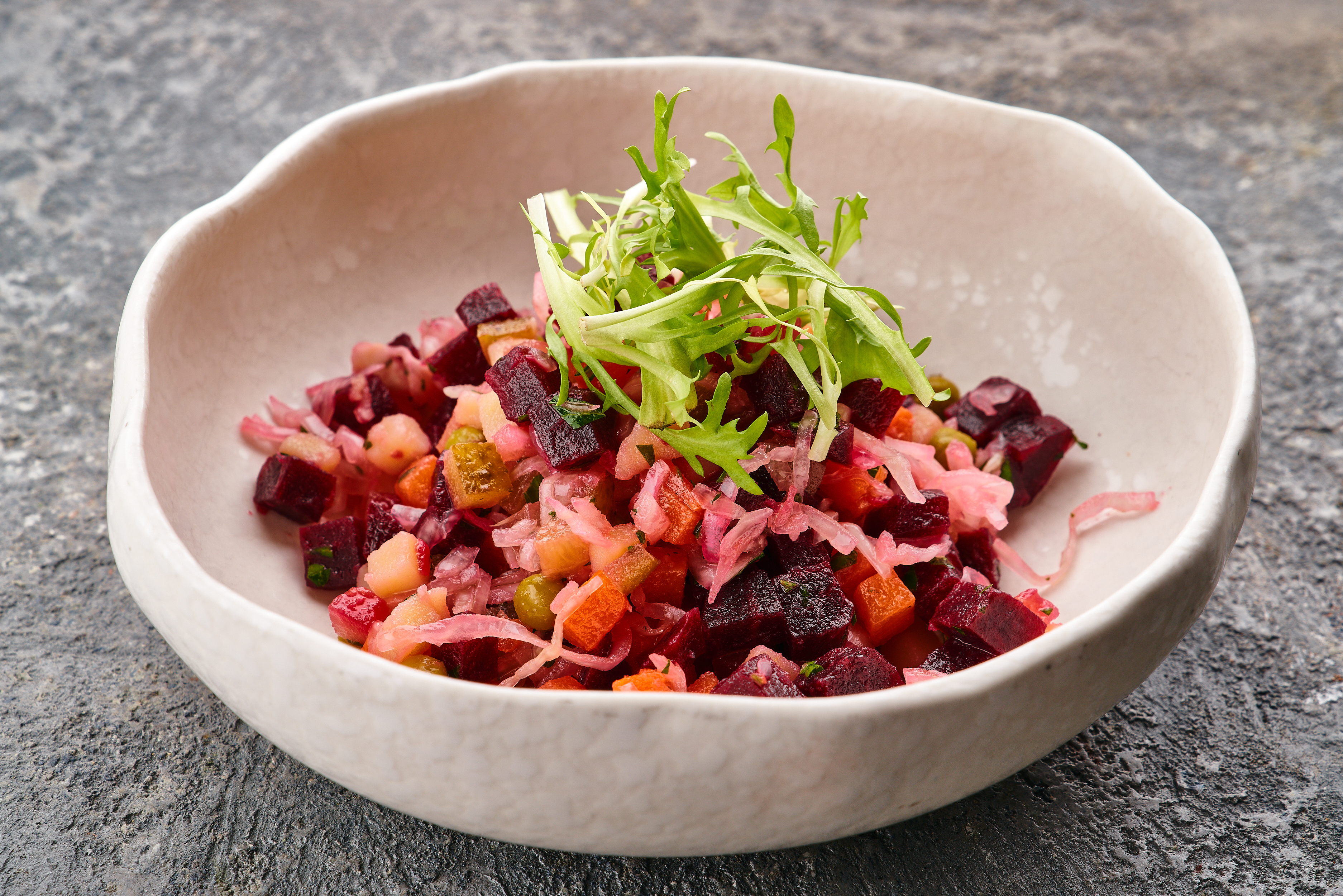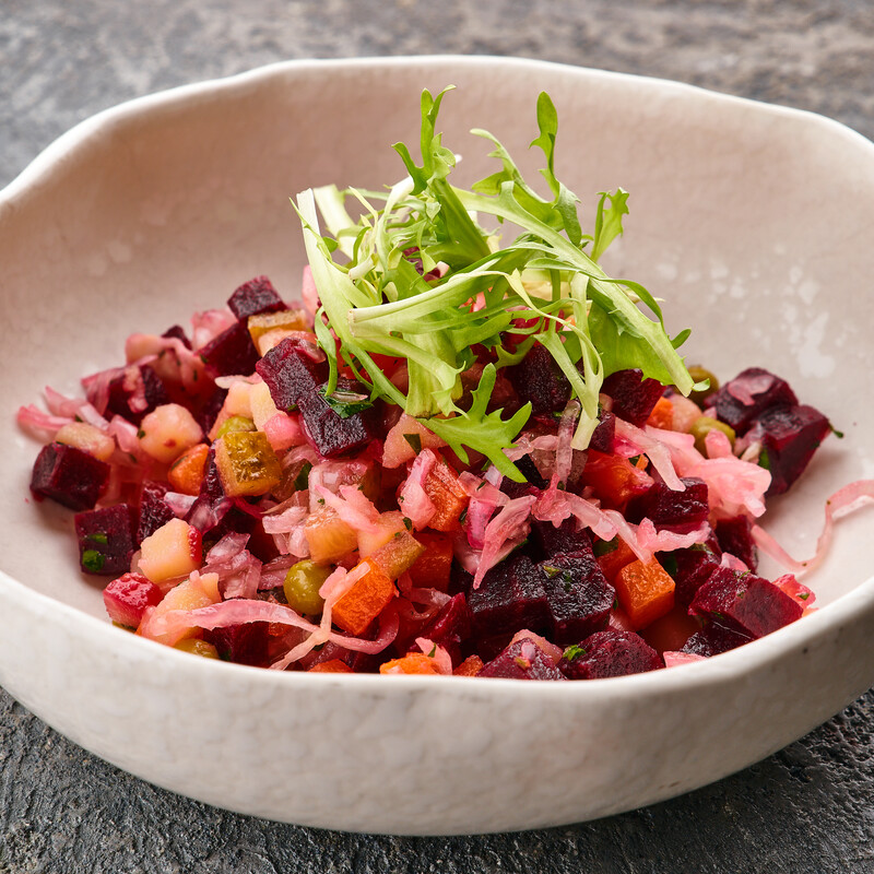 Состав: свекла, картофель, морковь, горошек зеленый, квашеная капуста, масло оливковое, зелень